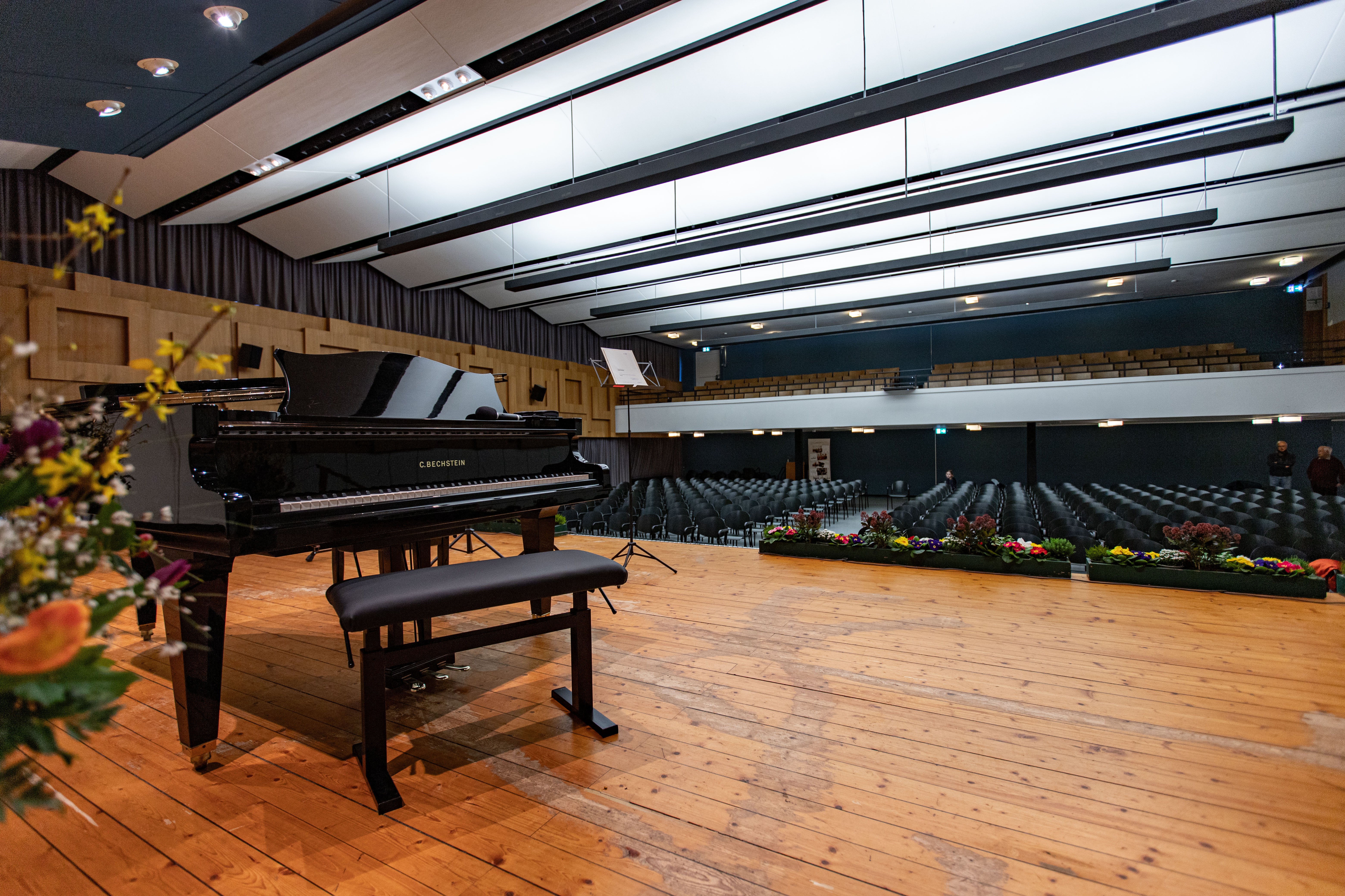1969 entstand der jetzige Lucia-Schäfer-Saal im Rahmen des Neubaus der Realschule. Beim Bau der Aula wurde offenbar viel Augenmerk der Akustik gewidmet. Bis heute loben die vortragenden Künstler und Zuschauer die besondere Akustik dieses Saales. Der Bechstein B-Flügel ist der Saalgröße und den akustischen Bedingungen perfekt angepasst. 2023 wurde er generalüberholt und ist in bester Verfassung.